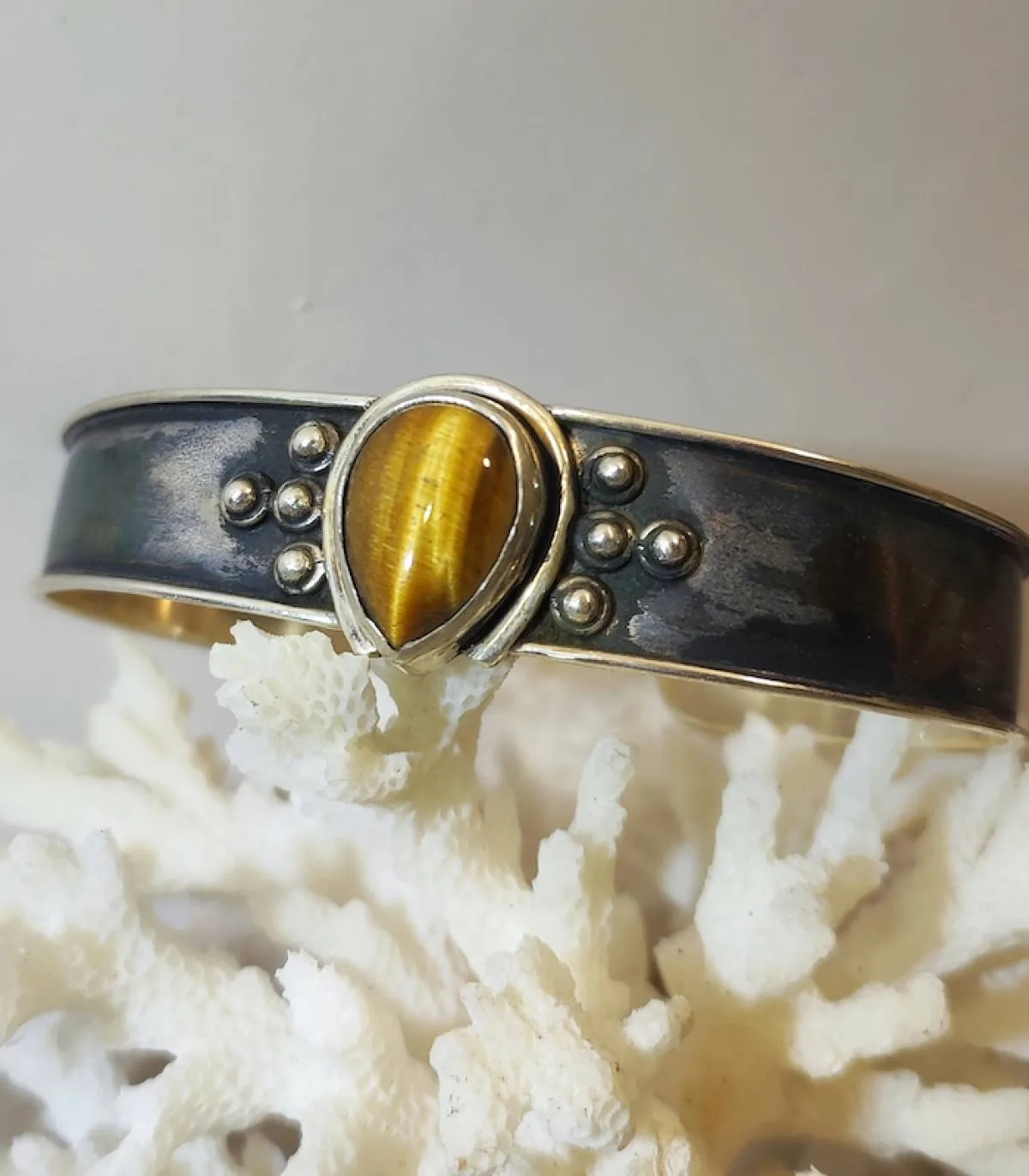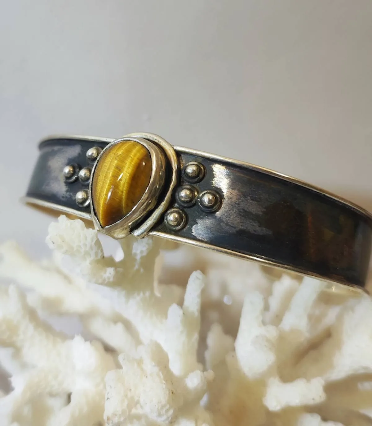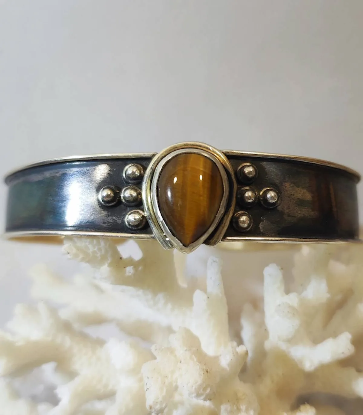 La large bande d'argent a bénéficié d'une oxydation contrôlée pour obtenir une patine sombre et profonde, accentuant le relief et le style tribal du bijou. Au centre, un cabochon d'Œil de Tigre, taillé en goutte d'eau, capte la lumière dévoilant des nuances dorées, fauves et ambrées qui rappellent l'œil vif d'un félin.