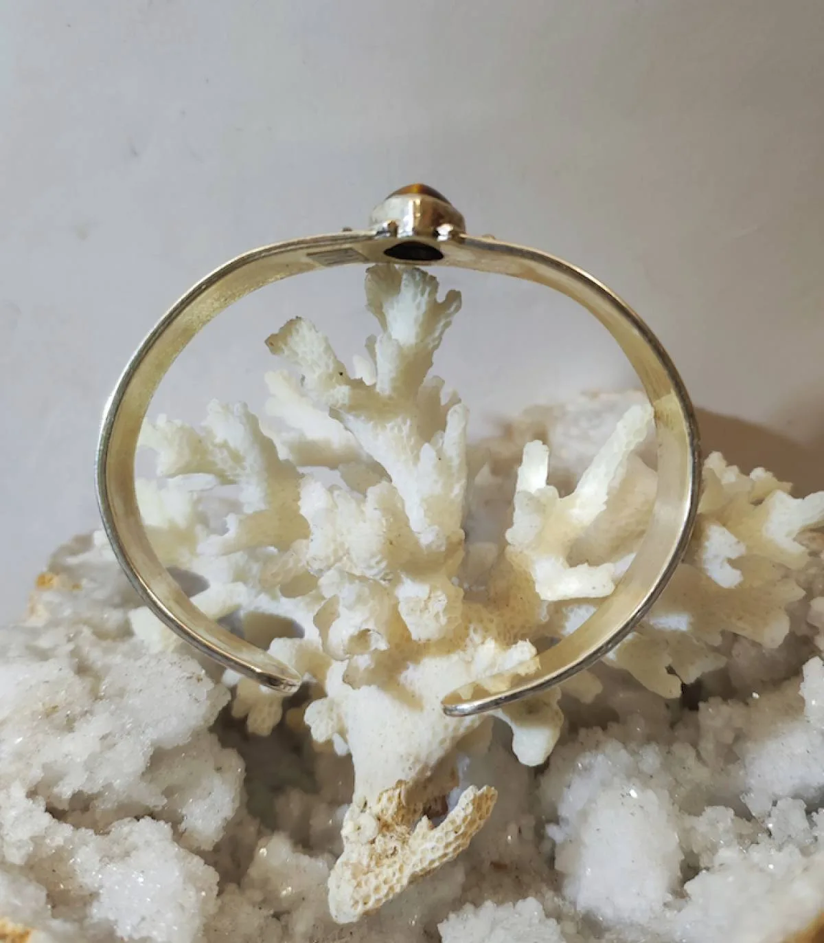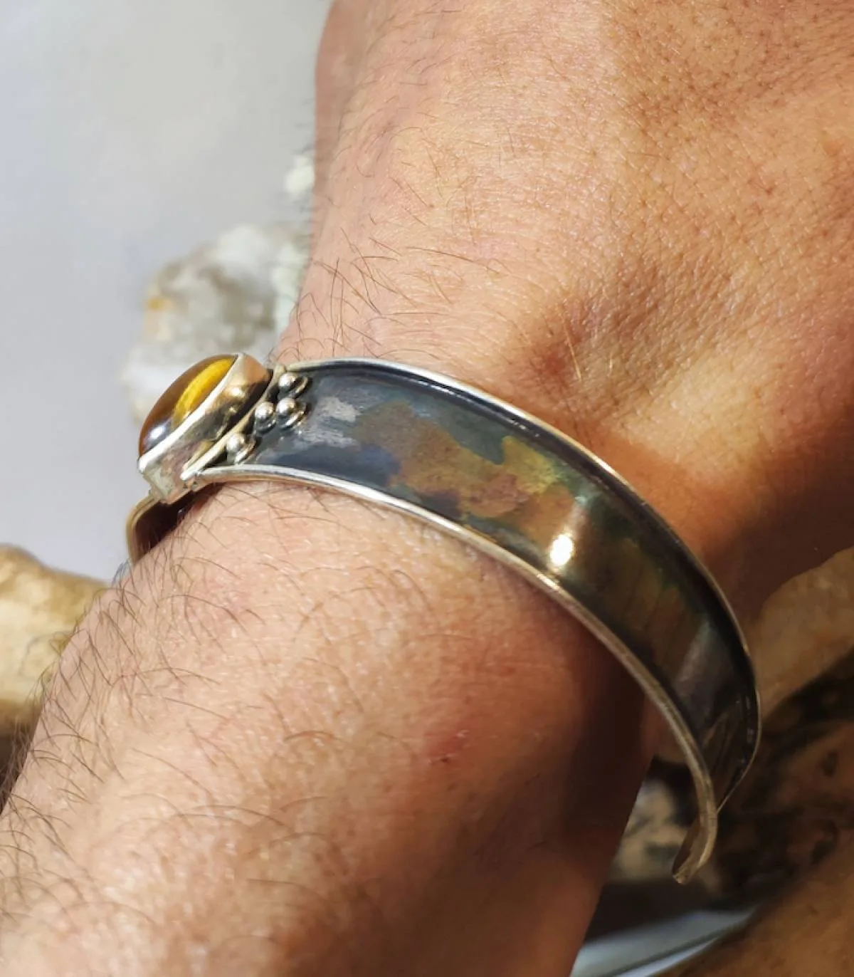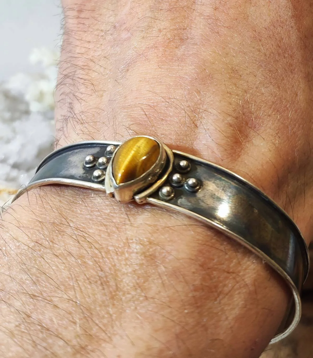 Découvrez ce bracelet manchette unisexe, une pièce de caractère qui allie l'éclat mystérieux de l'Œil de Tigre à l'esthétique brute et intemporelle de l'argent oxydé.