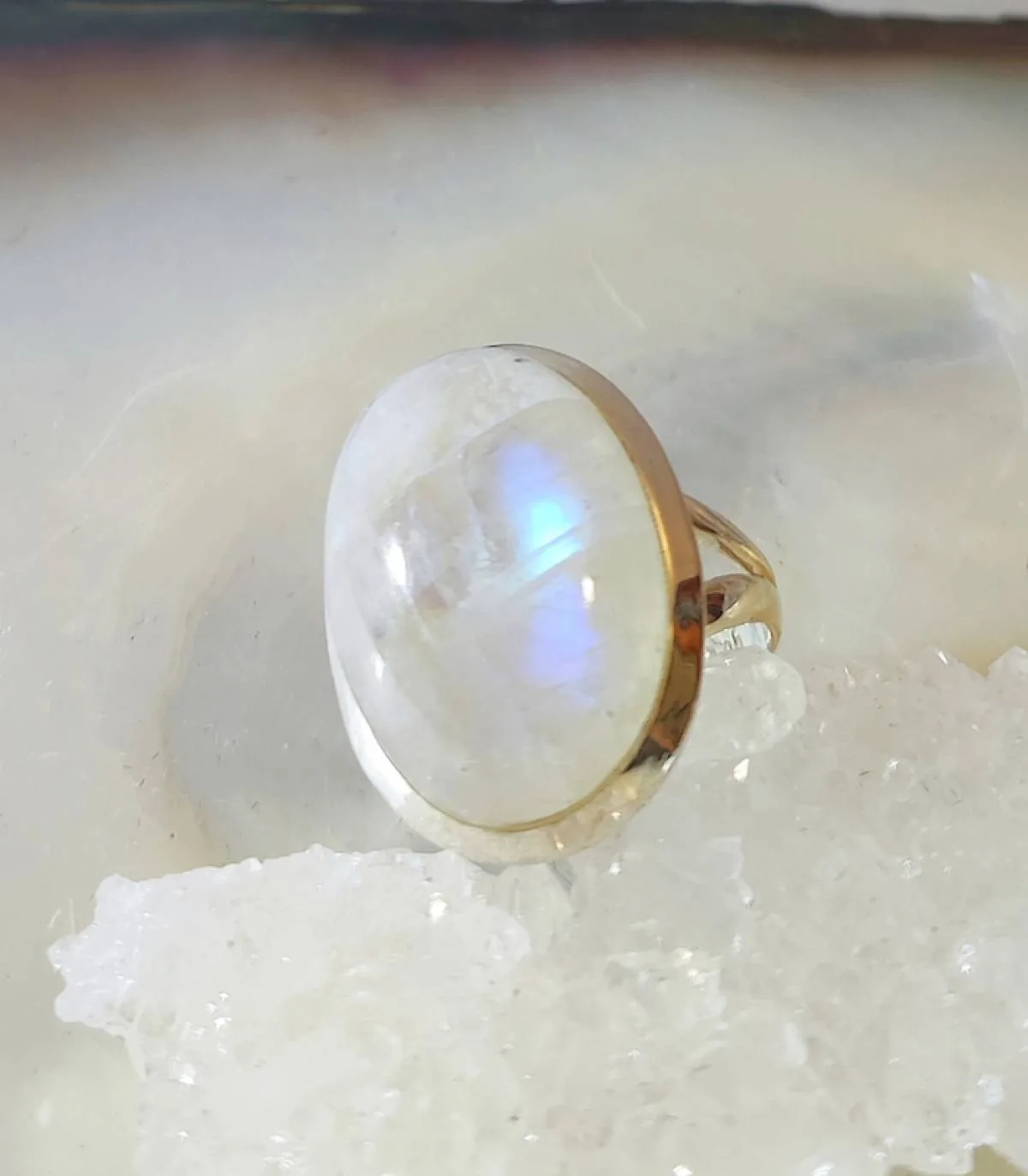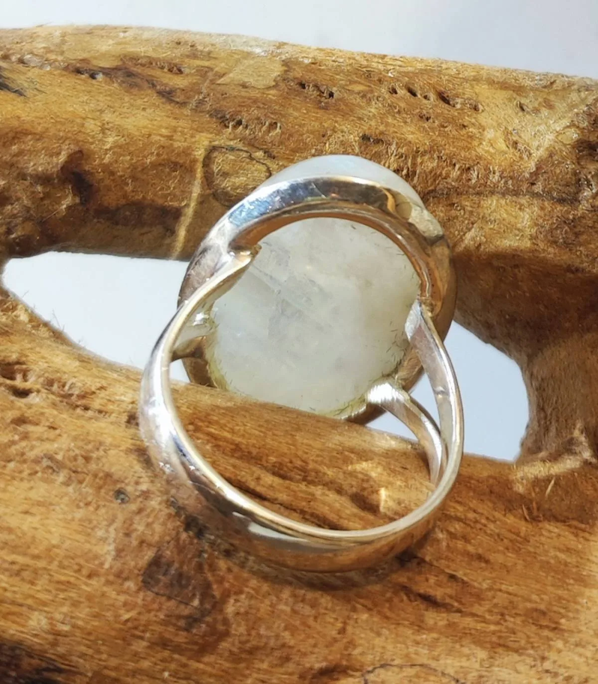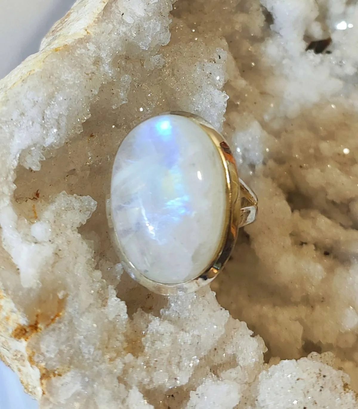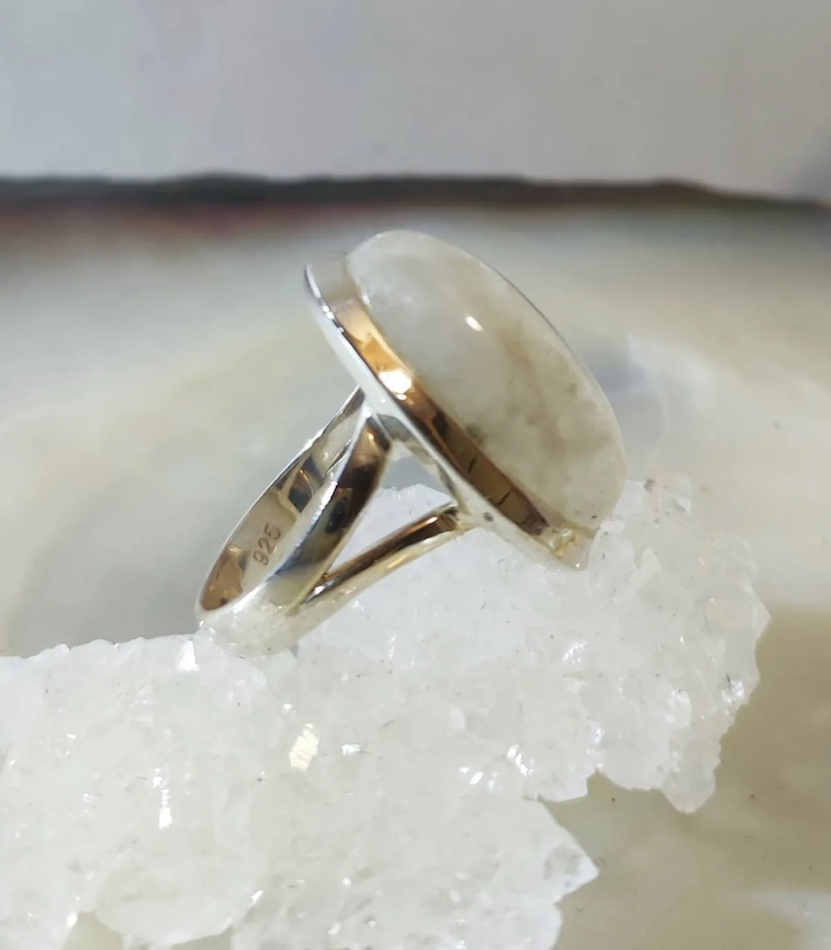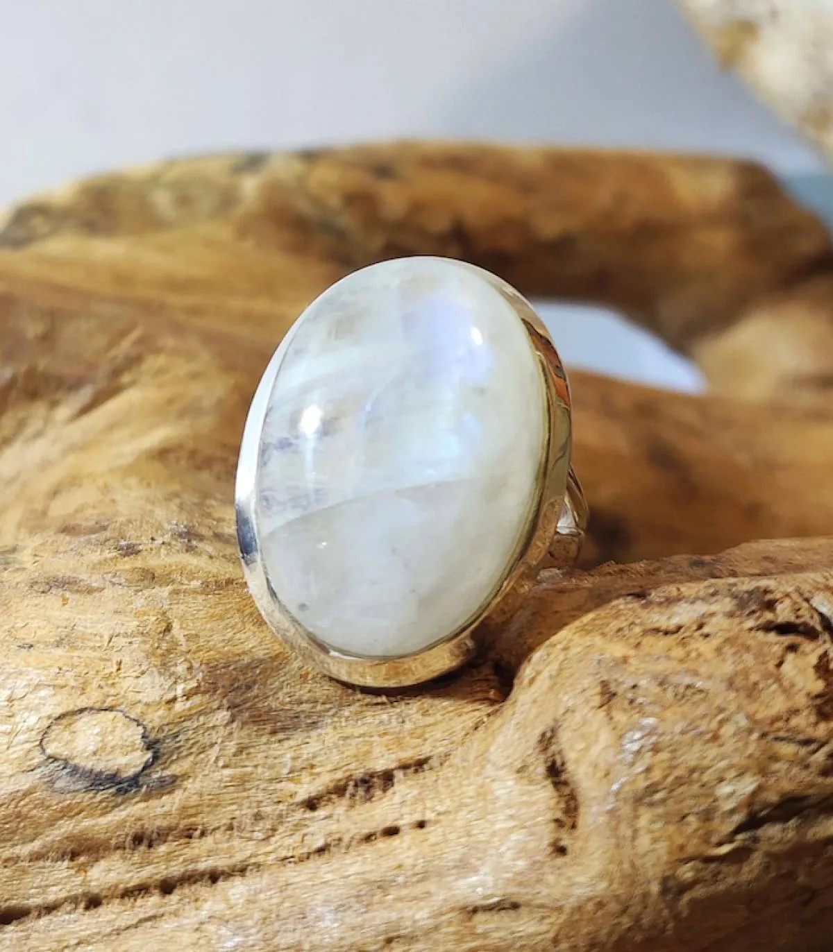 Cette bague artisanale composée d'argent 925 captera la magie opalescente d’une pierre de lune arc-en-ciel naturelle, sélectionnée pour ses reflets irisés.