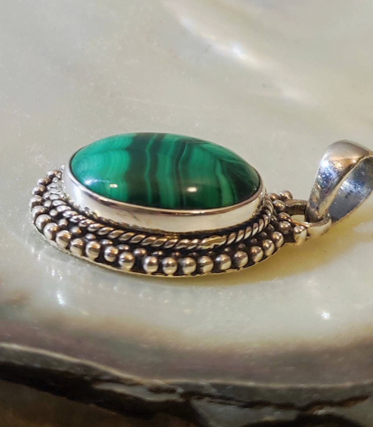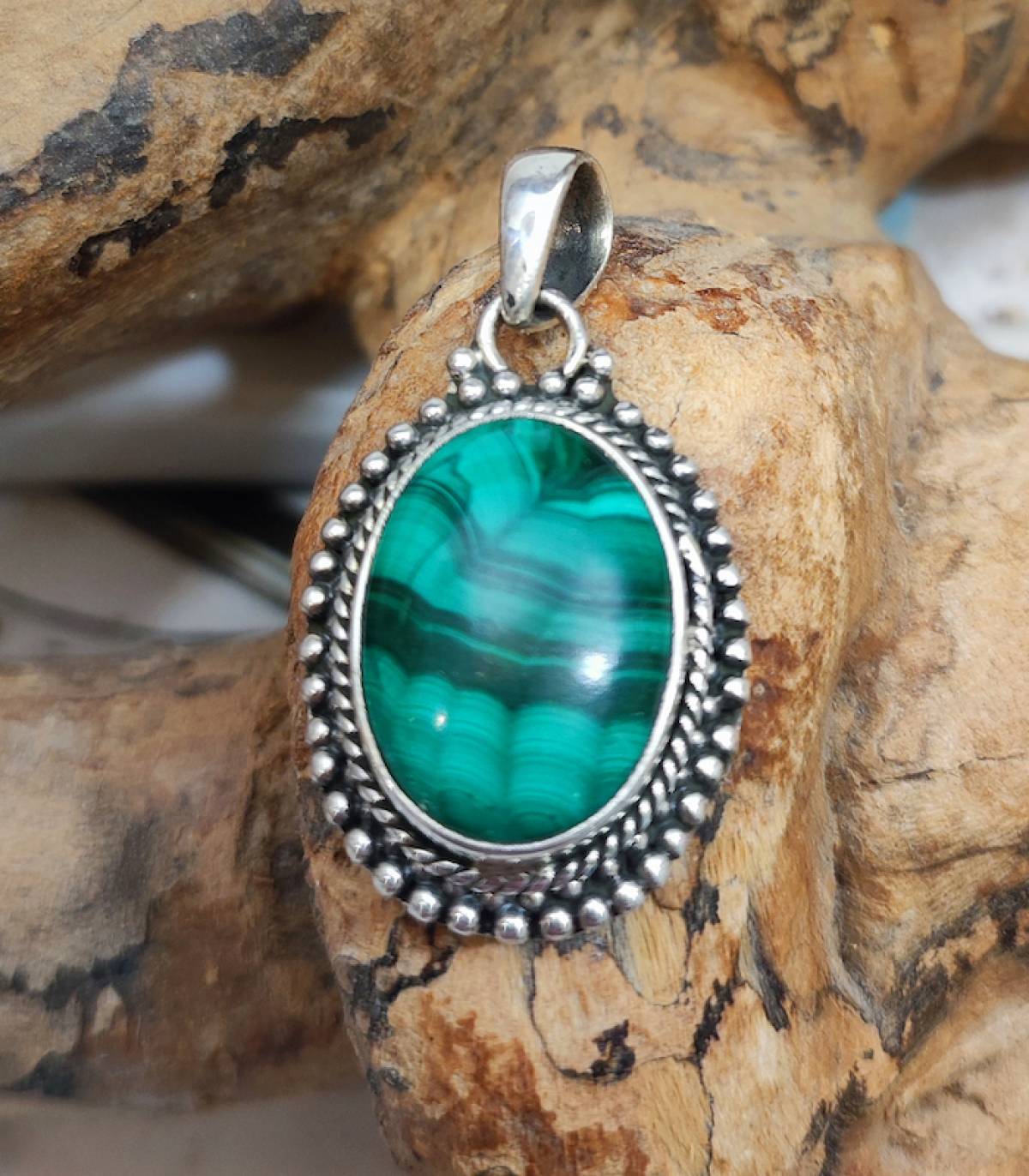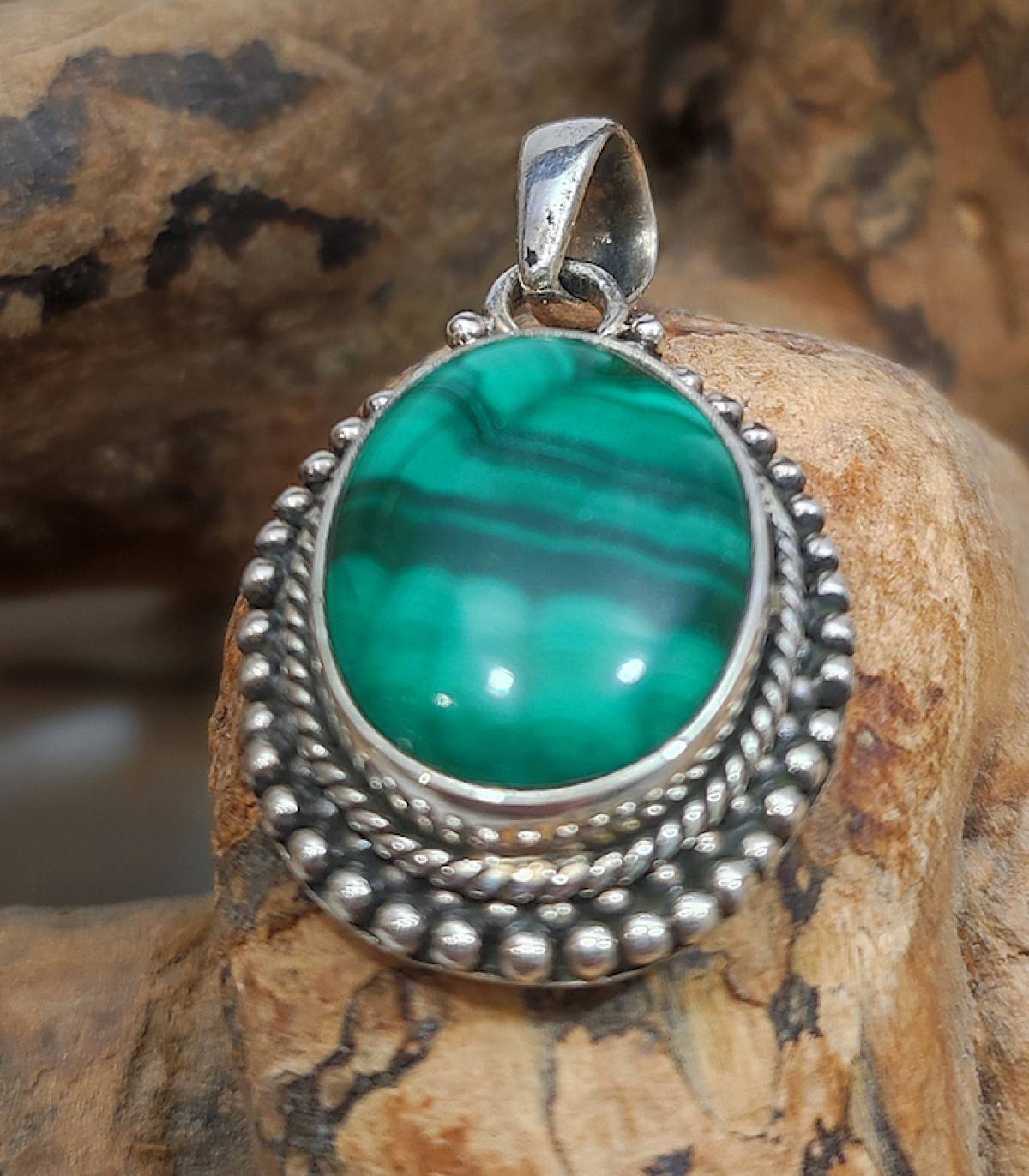 Ce pendentif est un bijou artisanal indien fabriqué dans les ateliers de nos artisans de confiance. Il est composé d'une pierre naturelle avec des dégradés de couleur verte appelée malachite.