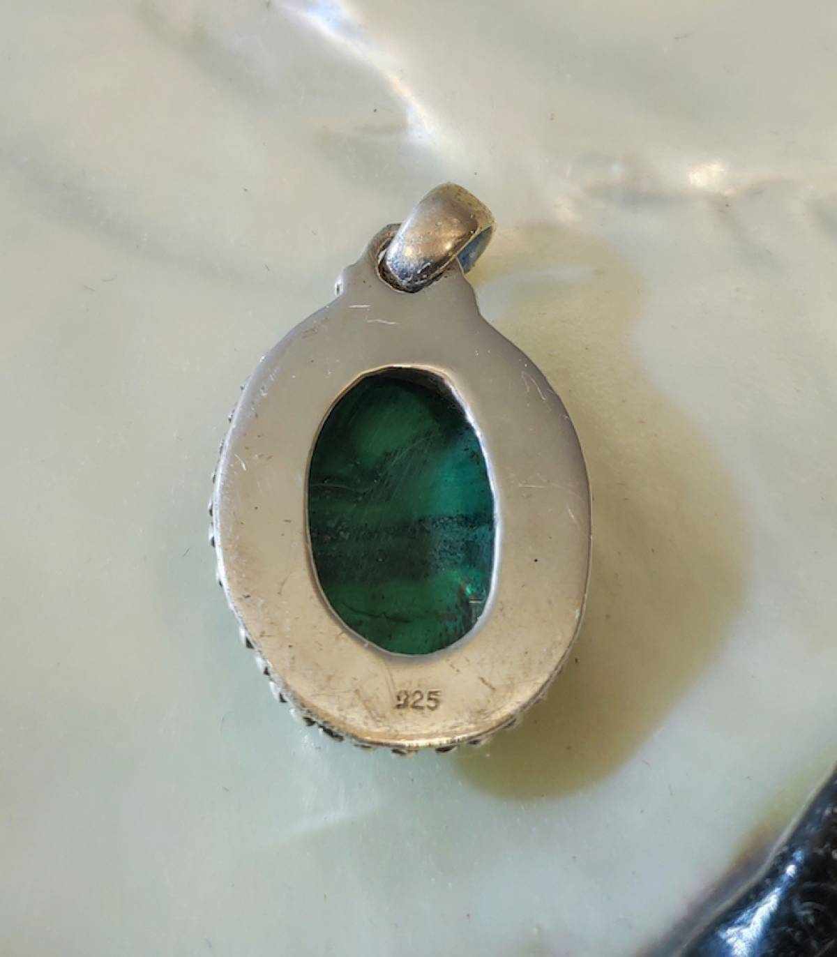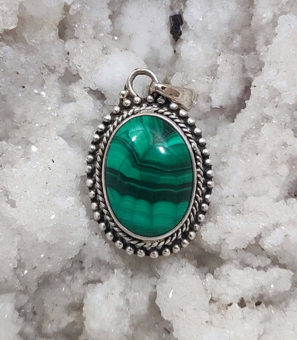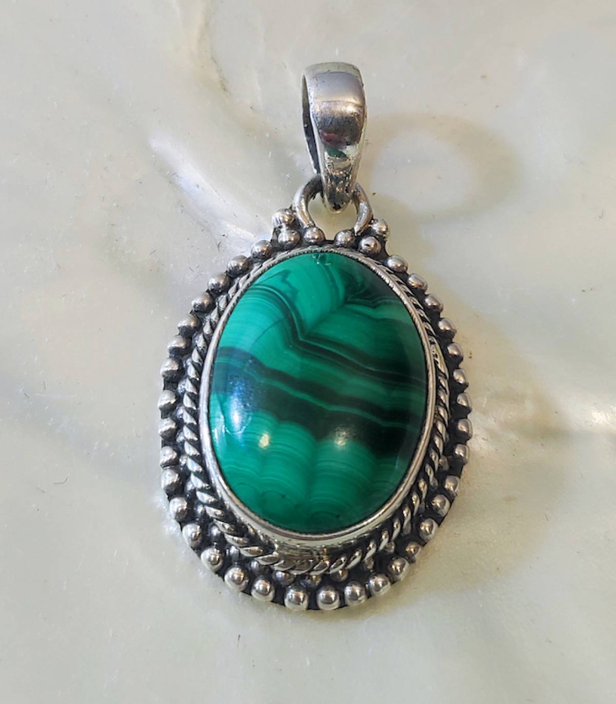 Ce pendentif est un bijou artisanal indien fabriqué dans les ateliers de nos artisans de confiance. Il est composé d'une pierre naturelle avec des dégradés de couleur verte appelée malachite.